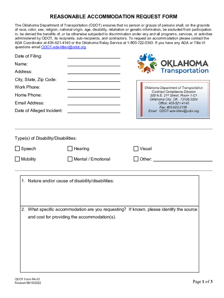 REASONABLE ACCOMMODATION REQUEST From The Oklahoma Department of Transportation (DOT) ensures that no person or groups of persons shall, on the grounds of race, color, sex, religion, national origin,