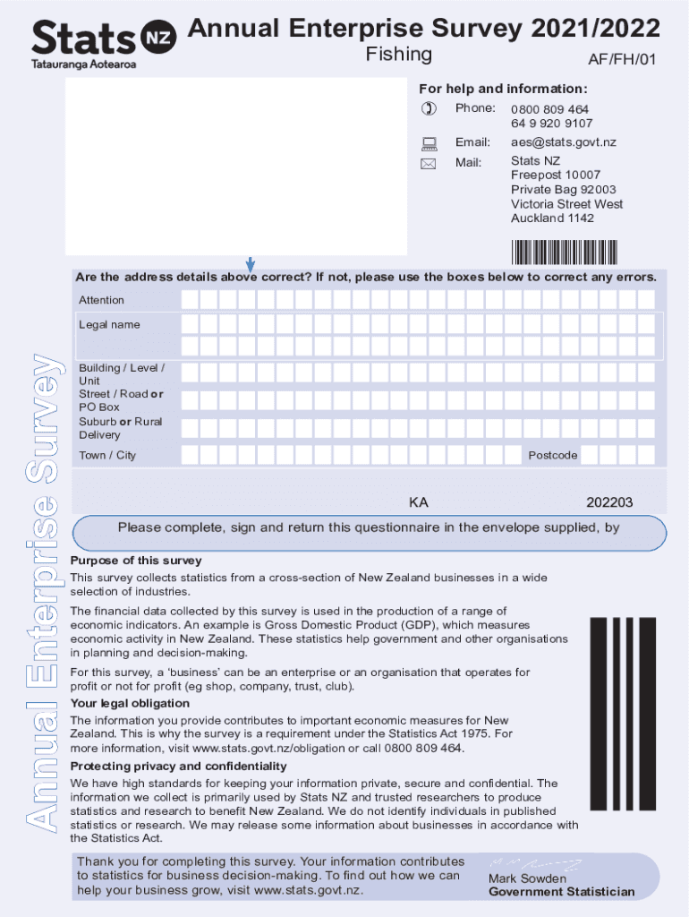 Annual Enterprise Survey 2021/2022 Fishing AF/FH/01For help and information:Phone:0800 809 464 64 9 920 9107Email:assistants.govt.email:Stats NZ Free post 10007 Private Bag 92003 Victoria Street West