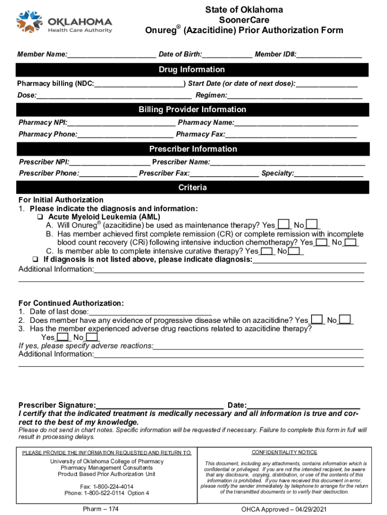State of Oklahoma Stoneware Inured () Prior Authorization Form Member Name:___ Date of Birth:___ Member ID#:___Drug Information Pharmacy billing (NDC:___) Start Date (or date of next dose):___ Dose:___