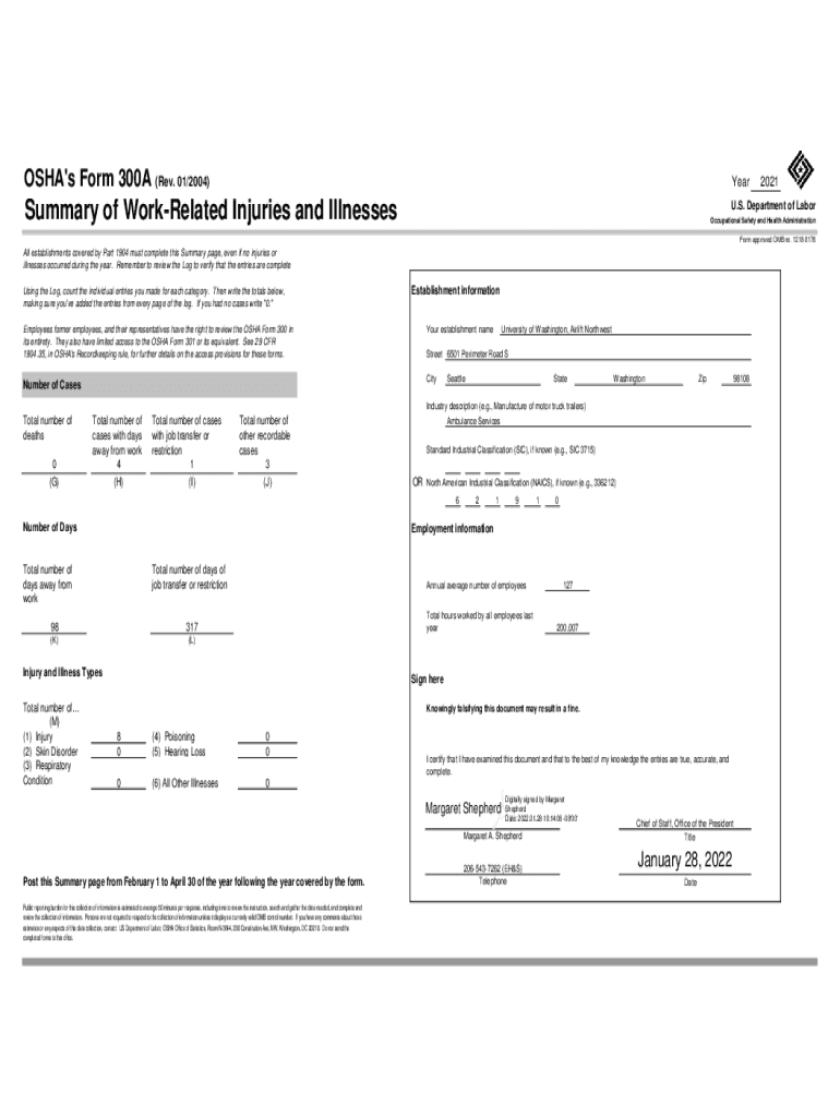 OSHA\'s Form 300A (Rev. 01/2004)YearSummary of Correlated Injuries and Illnesses. S. Department of Labor2021Occupational Safety and Health Administration Form approved OMB no. 12180176All establishments