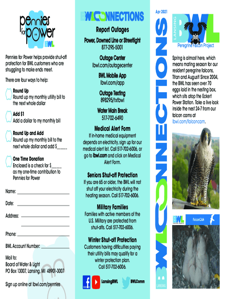 Apr 2021Report Outages Power, Downed Line or Streetlight 8772955001 Pennies for Power helps provide shutoff protection for BWL customers who are struggling to make ends meet. There are four ways to