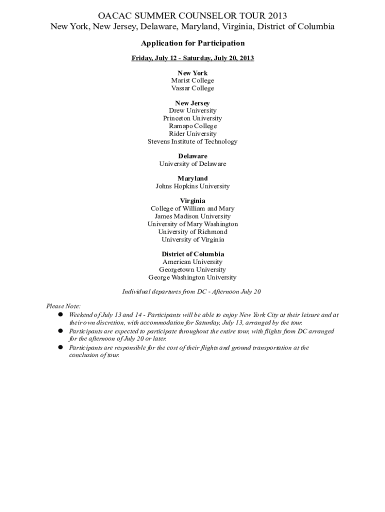 OSCAR SUMMER COUNSELOR TOUR 2013 New York, New Jersey, Delaware, Maryland, Virginia, District of Columbia Application for Participation Friday, July 12 Saturday, July 20, 2013, New York Marxist College
