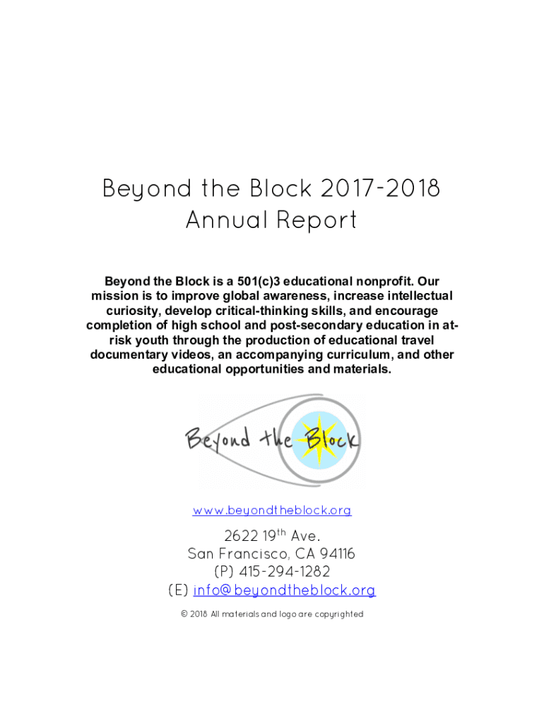 Beyond the Block 20172018 Annual Report Beyond the Block is a 501(c)3 educational nonprofit. Our mission is to improve global awareness, increase intellectual curiosity, develop critical thinking