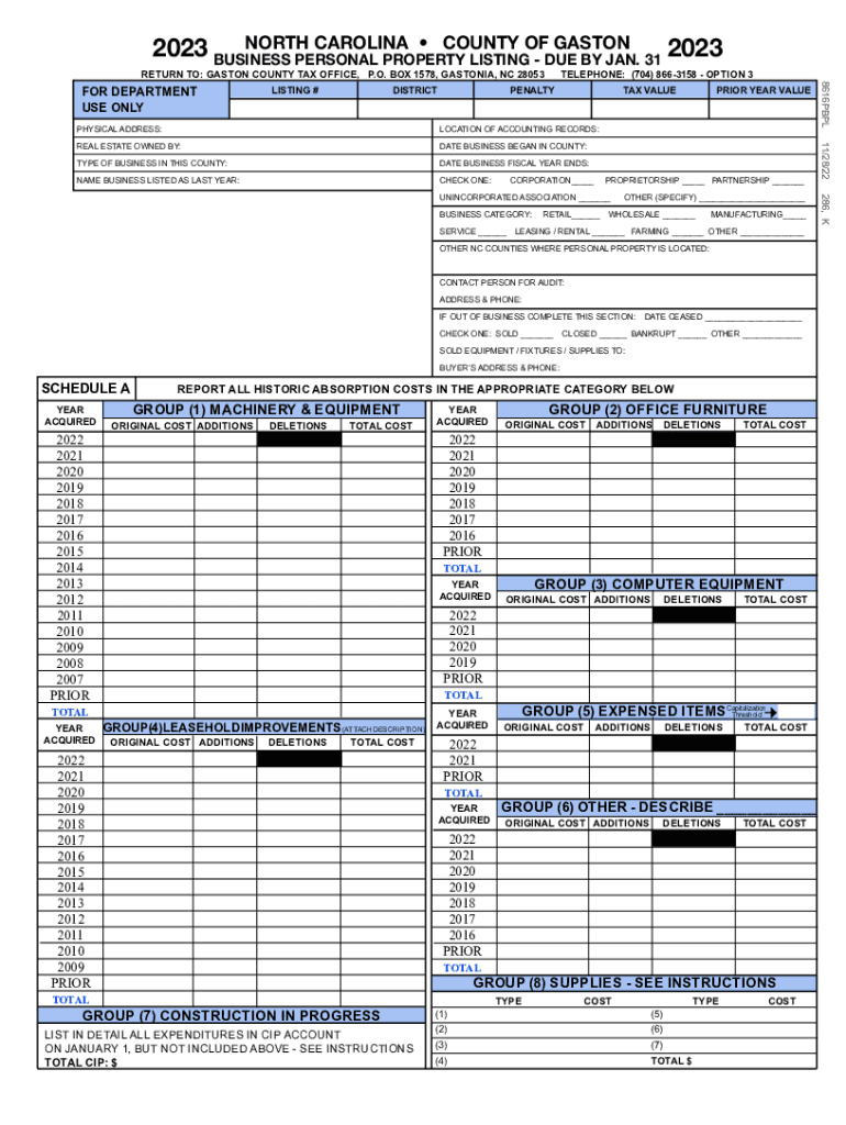 NORTH CAROLINA COUNTY OF GASTON 2023 BUSINESS 2023 PERSONAL PROPERTY LISTING DUE BY JAN. 31 RETURN TO: GASTON COUNTY TAX OFFICE, P.O. BOX 1578, GASTONIA, NC 28053 DISTRICTLISTING #TELEPHONE: (704)