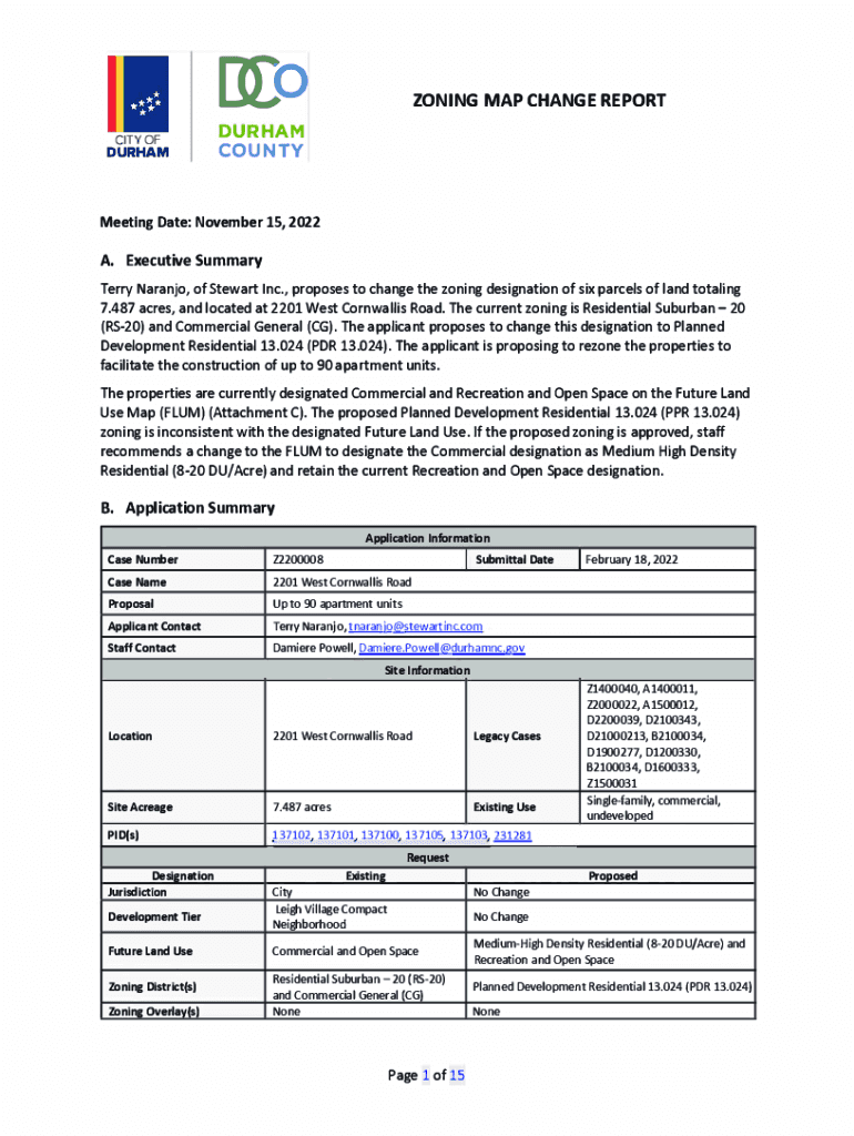 CITYOFDURHAMZONING MAP CHANGE REPORTDURHAMCOUNTYMeeting Date: November 15, 2022A. Executive Summary