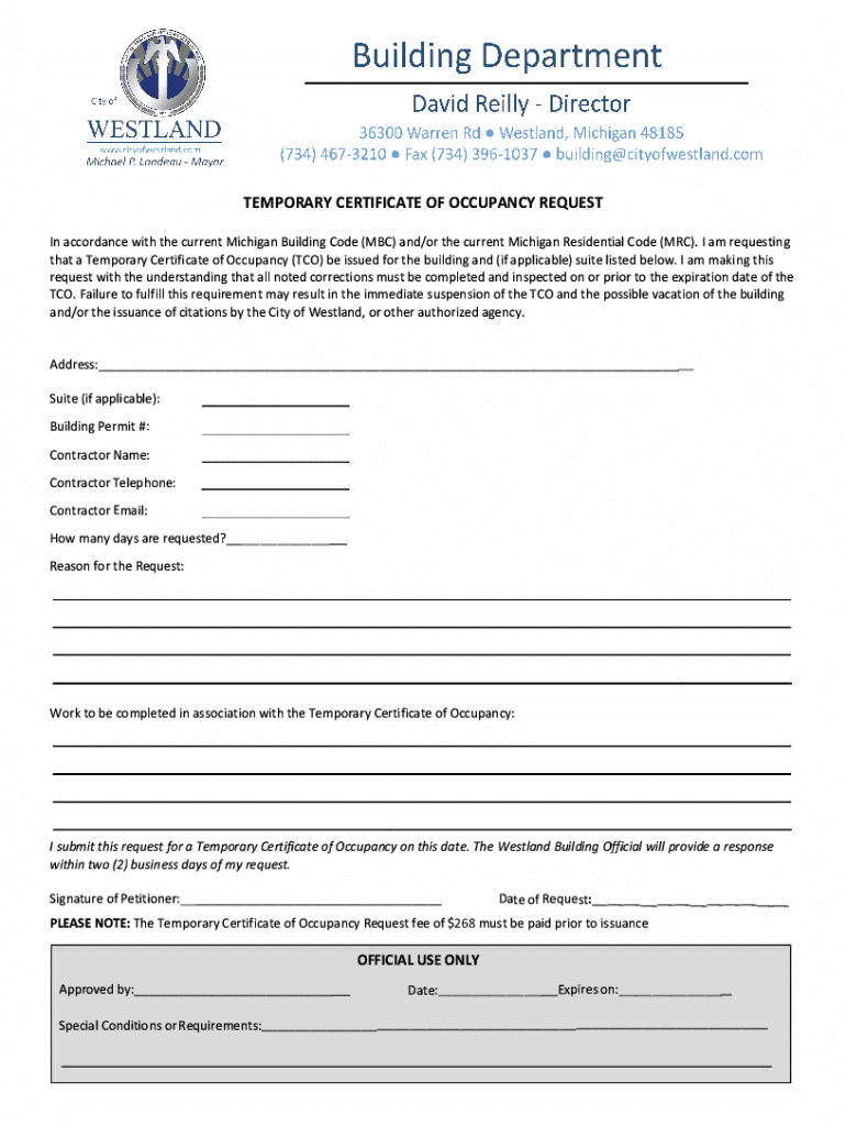 Get the free Temporary Certificate of Occupancy Request Form PDF - City of ...