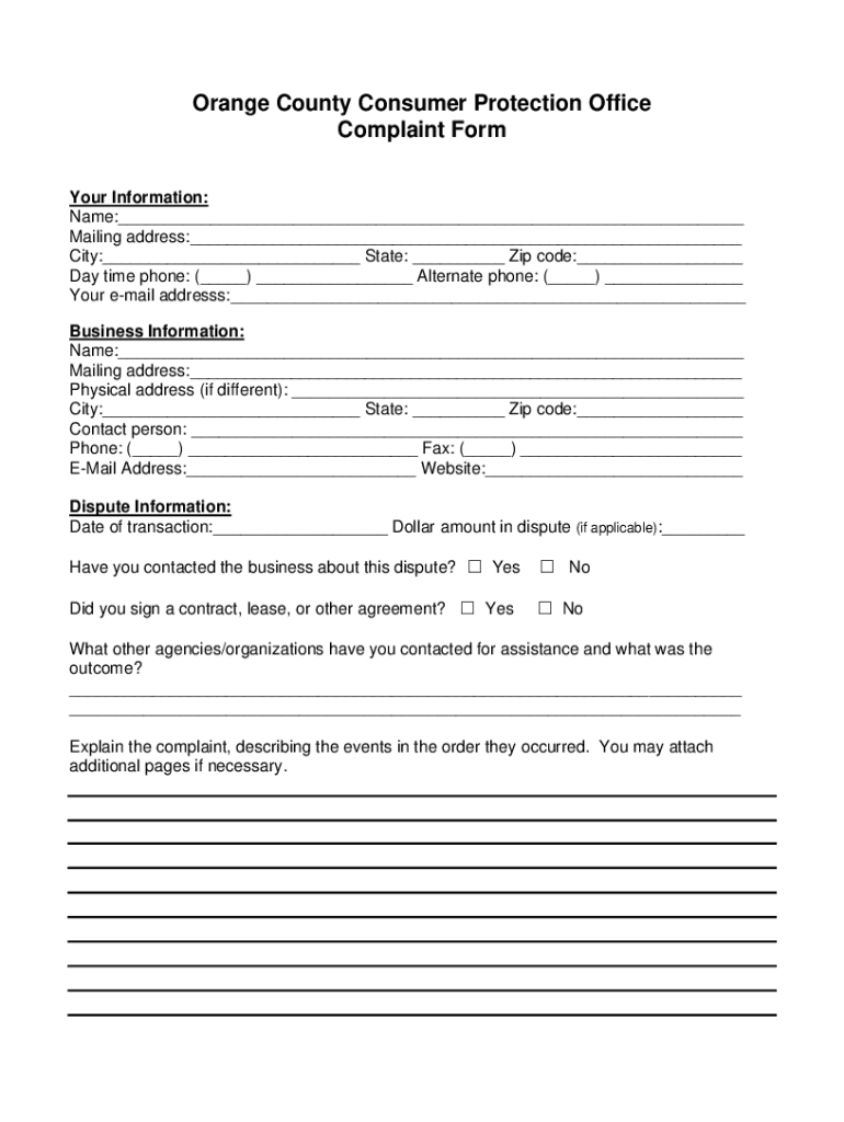 Orange County Consumer Protection Office Complaint Form Your Information: Name:___ Mailing address:___ City:___ State: ___ Zip code:___ Day time phone: (___) ___ Alternate phone: (___) ___ Your email