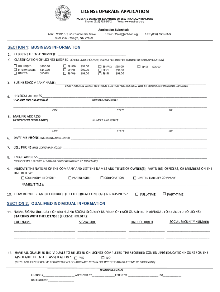 STATE BOARD OF EXAMINERS OF ELECTRICAL CONTRACTORS 3101 INDUSTRIAL DRIVE, SUITE 206, RALEIGH, NC 27609 PHONE: 9197339042 FAX: 8006918399 WEB: www.ncbeec.orgAPPLICATION TO UPGRADE LICENSE IMPORTANT