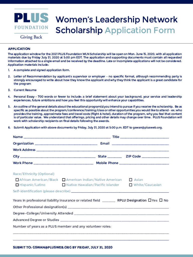 Women's Leadership Network Scholarship Application Forgiving Bathe PLUS Foundations Women's Leadership Network (WON) began in 2009. In the past ten years we have been successful in creating opportunities