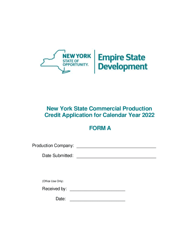 New York State Commercial Production Credit Application for Calendar Year 2022 FORM A Production Company: Date Submitted:(Office Use Only)Received by: Date:Form A (1/23) Page 2 of 6SECTION ONE: Applicant/Company