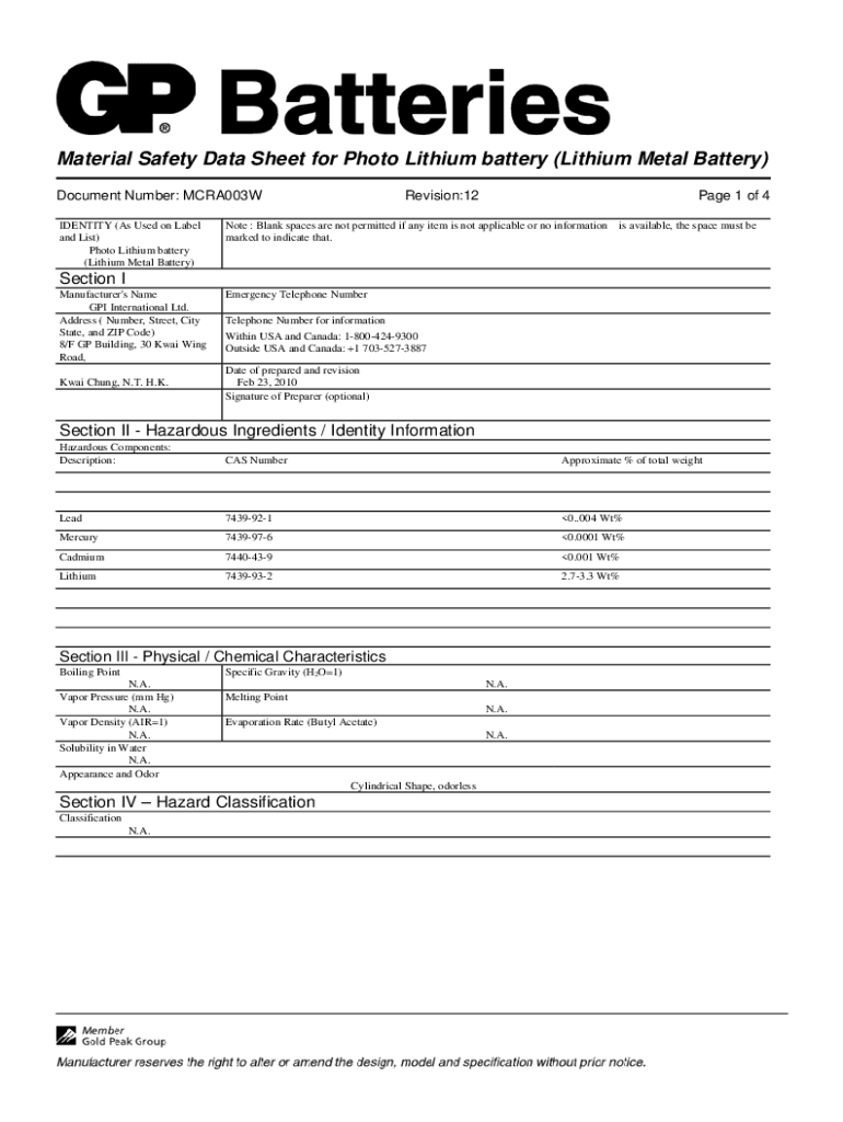 Material Safety Data Sheet for Photo Lithium battery (Lithium Metal Battery) Document Number: MCRA003W IDENTITY (As Used on Label and List) Photo Lithium battery (Lithium Metal Battery)Revision:12Page