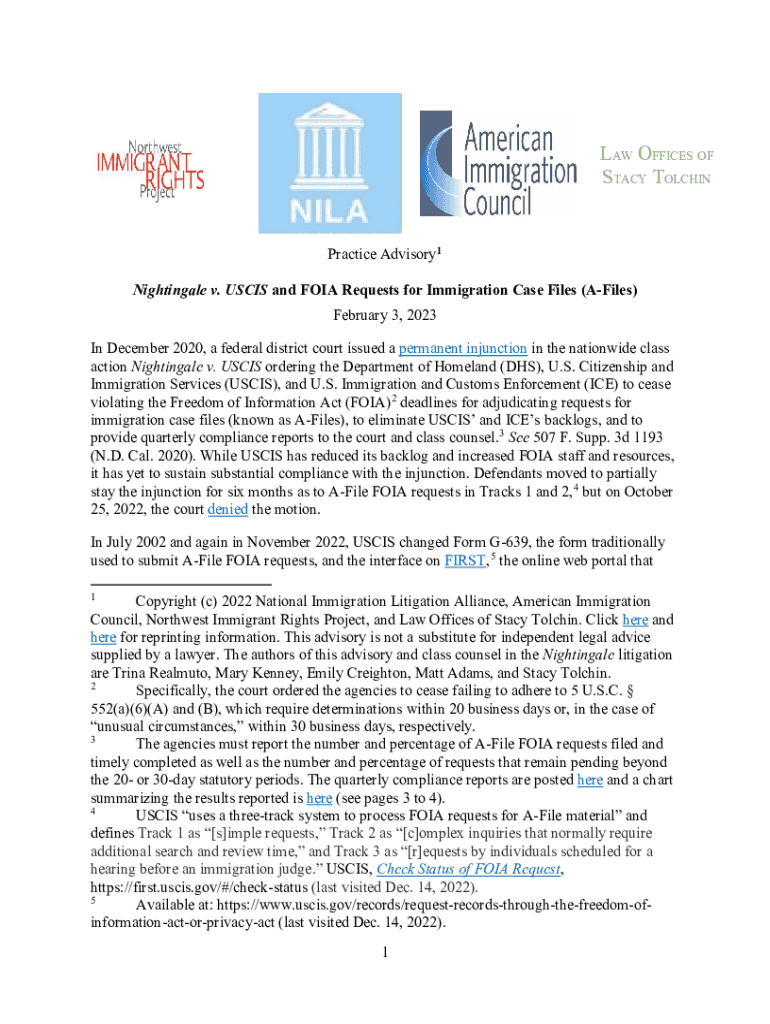 LAW OFFICES OF STACY TOLCHINPractice Advisory 1 Nightingale v. USCIS and FOIA Requests for Immigration Case Files (Files) February 3, 2023, In December 2020, a federal district court issued a permanent