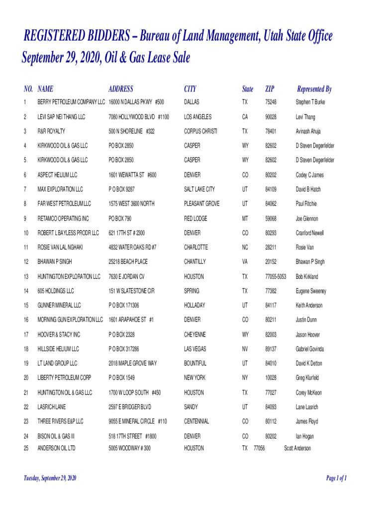 REGISTERED BIDDERS Bureau of Land Management, Utah State Office September 29, 2020, Oil & Gas Lease Sale NO. NAMEADDRESSCITYStateZIPRepresented By1BERRY PETROLEUM COMPANY LLC 16000 N DALLAS PKWY #500DALLASTX75248Stephen