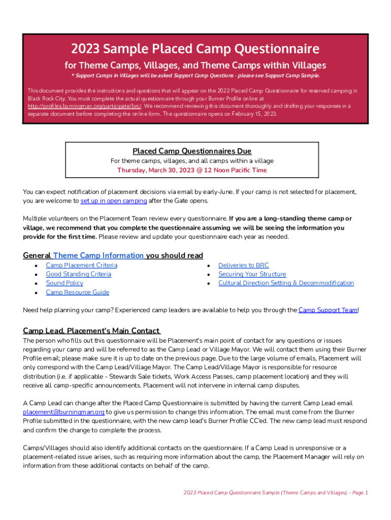 2023 Sample Placed Camp Questionnaire for Theme Camps, Villages, and Theme Camps within Villages * Support Camps in Villages will be asked Support Camp Questions please see Support Camp Sample. This