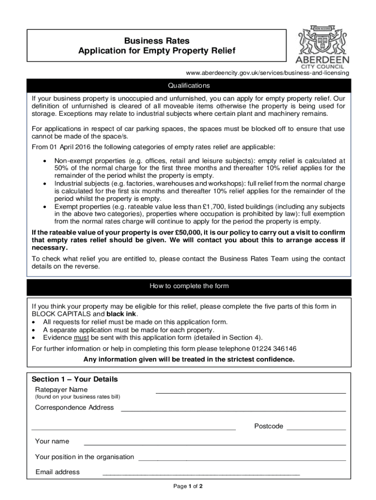 Business Rates Application for Empty Property Relief www.aberdeencity.gov.uk/services/businessandlicensingQualifications If your business property is unoccupied and unfurnished, you can apply for