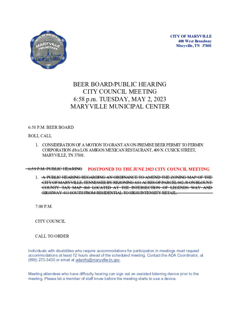 Get the free Notice of Beer Board, Public Hearing - Maryville