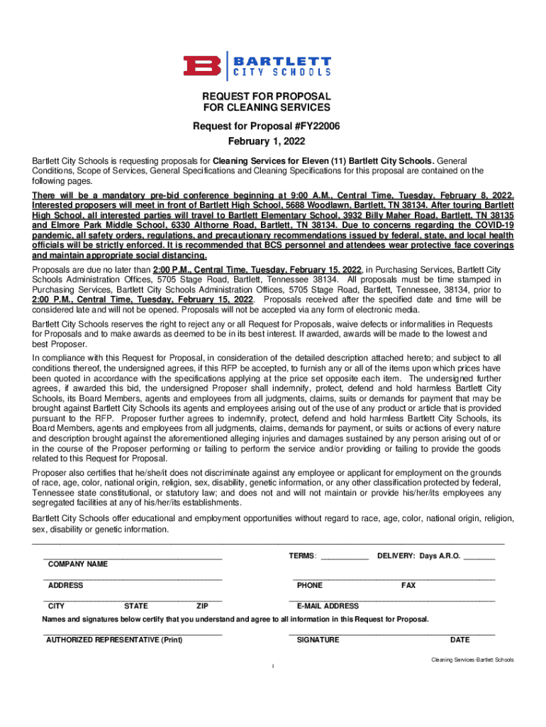 REQUEST FOR PROPOSAL FOR CLEANING SERVICES Request for Proposal #FY22006 February 1, 2022, Bartlett City Schools is requesting proposals for Cleaning Services for Eleven (11) Bartlett City Schools.