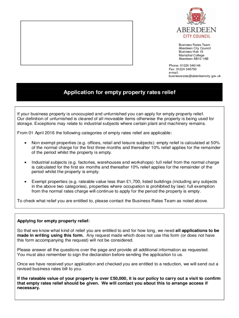 Business Rates Team Aberdeen City Council Business Hub 16 Marshal College Aberdeen AB10 1AB Phone: 01224 346146 Fax: 01224 346700 email: businessrates@aberdeencity.gov.ukApplication for empty property