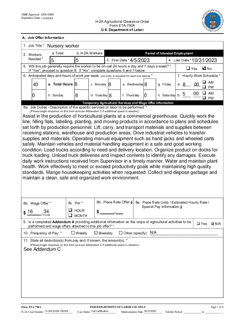 OMB Approval: 12050466 Expiration Date: 11/30/2025H2A Agricultural Clearance Order Form ETA790A U.S. Department of Labor. Job Offer Information 1. Job Title *Nursery worker2. Workers Needed *a. Total.