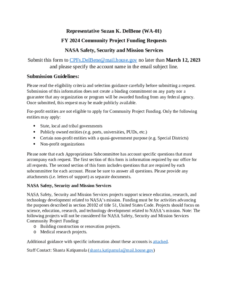 The NASA Safety, Security and Mission Services - Suzan DelBene - delbene house is a document needed to be submitted to the specific address to provide certain information. It must be filled-out and signed, which is possible in hard copy, or with the help of a certain solution such as PDFfiller. It allows to fill out any PDF or Word document right in the web, customize it depending on your requirements and put a legally-binding electronic signature. Right away after completion, the user can easily send the NASA Safety, Security and Mission Services - Suzan DelBene - delbene house to the relevant receiver, or multiple ones via email or fax. The editable template is printable too because of PDFfiller feature and options presented for printing out adjustment. In both digital and physical appearance, your form will have a clean and professional look. You may also turn it into a template for later, without creating a new file over and over. All you need to do is to amend the ready form.