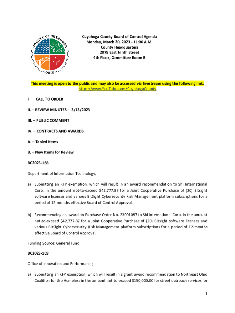 Cuyahoga County Board of Control Agenda Monday, March 20, 2023 11:00 A.M. County Headquarters 2079 East Ninth Street 4th Floor, Committee Room This meeting is open to the public and may also be accessed