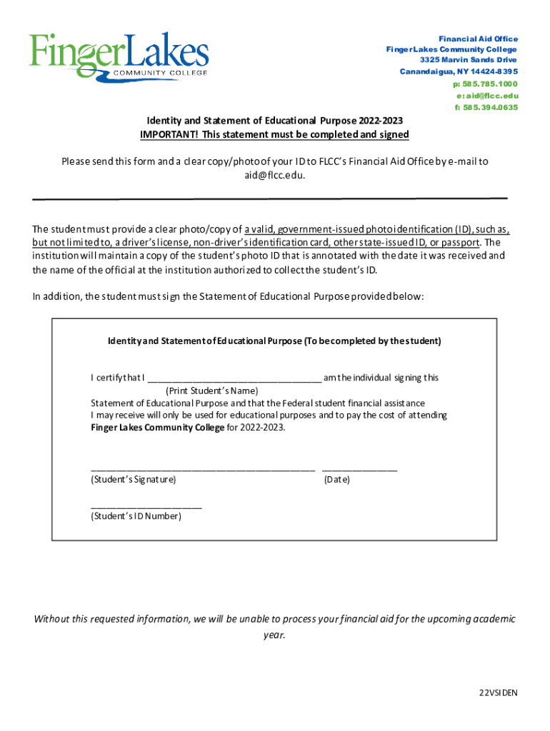 Financial Aid Office Finger Lakes Community College 3325 Marvin Sands Drive Canandaigua, NY 144248395 p: 585.785.1000 e: aid@flcc.edu f: 585.394.0635Identity and Statement of Educational Purpose 20222023