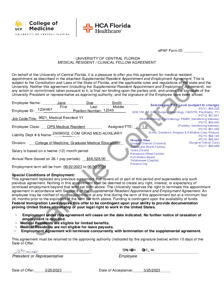 EPF Form ID: ___ UNIVERSITY OF CENTRAL FLORIDA MEDICAL RESIDENT / CLINICAL FELLOW AGREEMENTctOn behalf of the University of Central Florida, it is a pleasure to offer you this agreement for medical
