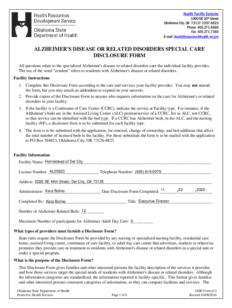 Health Facility Systems 1000 NE 10th Street Oklahoma City, OK 7311712078823 Phone 405.271.6868 Fax 405.271.7360 Email HealthResources@health.ok.govALZHEIMER\'S DISEASE OR RELATED DISORDERS SPECIAL