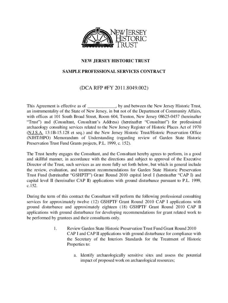 NEW JERSEY HISTORIC TRUST SAMPLE PROFESSIONAL SERVICES CONTRACT(DCA RFP #FY 2011.8049.002)This Agreement is effective as of ___, by and between the New Jersey Historic Trust, an instrumentality of