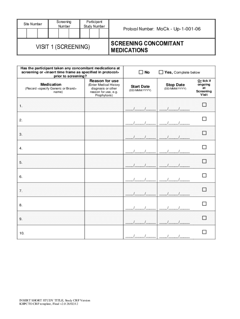 Site NumberScreening NumberParticipant Study NumberVISIT 1 (SCREENING)Protocol Number: Mock Up100106SCREENING CONCOMITANT Medications the participant taken any concomitant medications at screening
