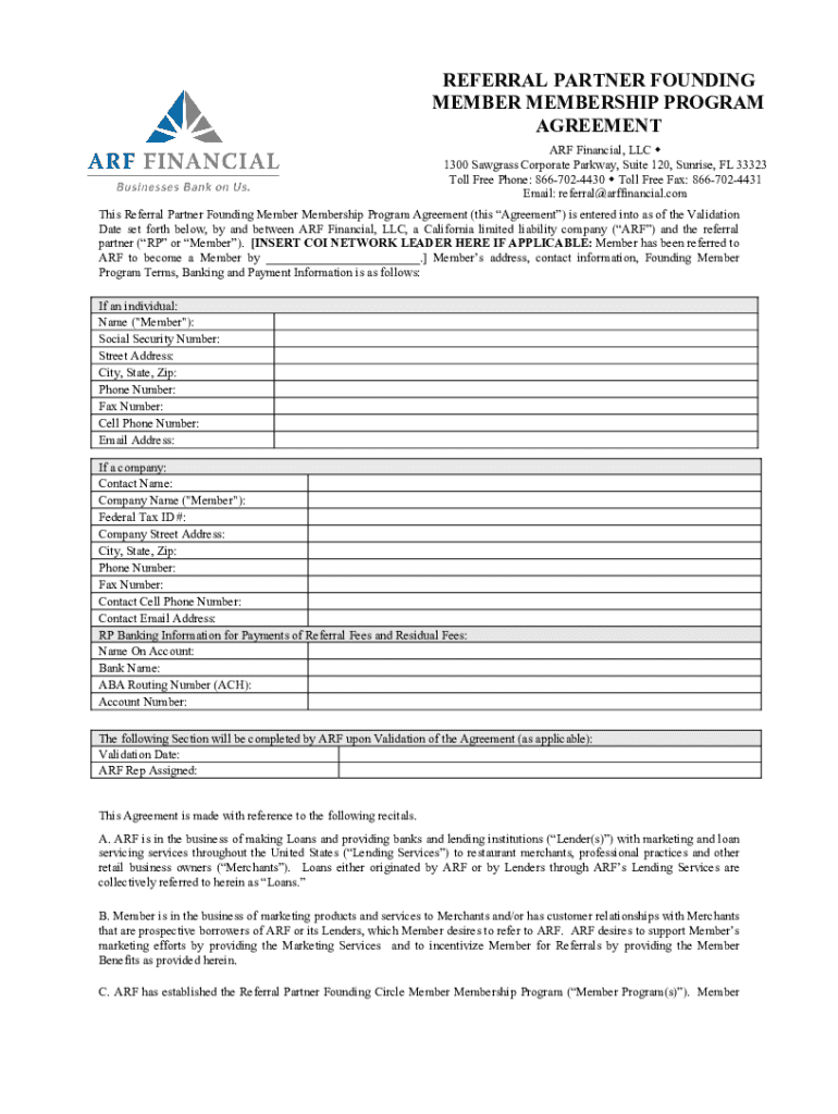 REFERRAL PARTNER FOUNDING MEMBER MEMBERSHIP PROGRAM AGREEMENT ARF Financial, LLC 1300 Saw grass Corporate Parkway, Suite 120, Sunrise, FL 33323 Toll Free Phone: 8667024430 Toll Free Fax: 8667024431