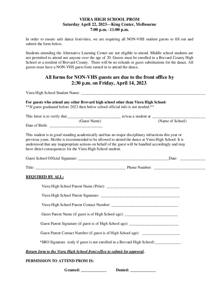 VERA HIGH SCHOOL PROM Saturday, April 22, 2023King Center, Melbourne 7:00 p.m. 11:00 p.m. In order to ensure safe dance festivities, we are requiring all NONVHS student guests to fill out and submit