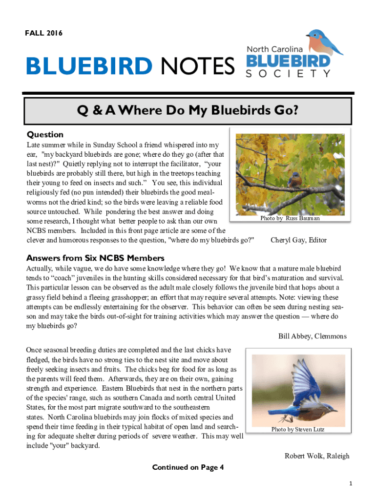 FALL 2016BLUEBIRD NOTES Q & A Where Do My Bluebirds Go? Question Late summer while in Sunday School a friend whispered into my ear, \” my backyard bluebirds are gone; where do they go (after that