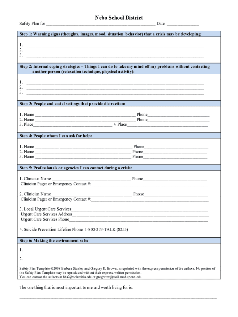 Nero School District Safety Plan for ___ Date: ___ Step 1: Warning signs (thoughts, images, mood, situation, behavior) that a crisis may be developing: 1. ___ 2. ___ 3. ___ Step 2: Internal coping