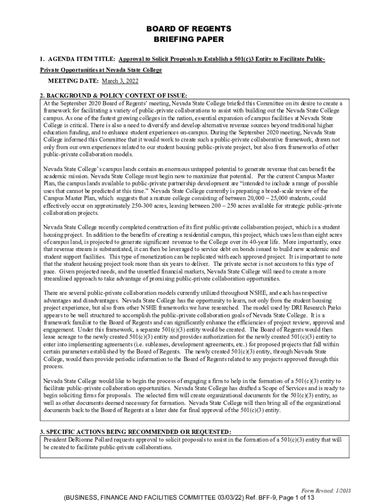 BOARD OF REGENTS BRIEFING PAPER 1. AGENDA ITEM TITLE: Approval to Solicit Proposals to Establish a 501(c)3 Entity to Facilitate Public Private Opportunities at Nevada State College MEETING DATE: March