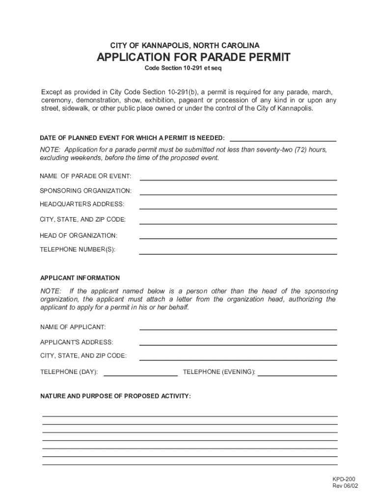 CITY OF KANNAPOLIS, NORTH CAROLINAAPPLICATION FOR PARADE PERMIT Code Section 10291 ET except as provided in City Code Section 10291(b), a permit is required for any parade, march, ceremony, demonstration,