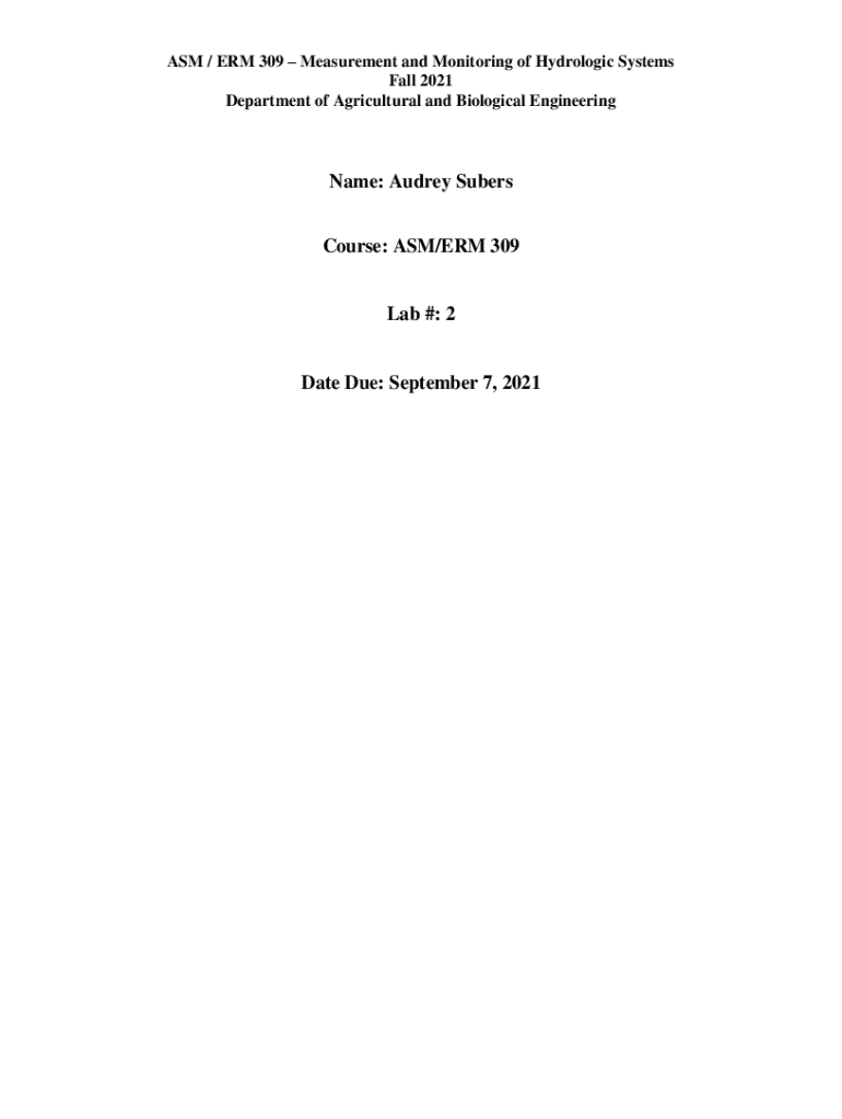 ASM / ERM 309 Measurement and Monitoring of Hydrologic Systems Fall 2021 Department of Agricultural and Biological EngineeringName: Audrey Tubers Course: ASM/ERM 309Lab #: 2Date Due: September 7,