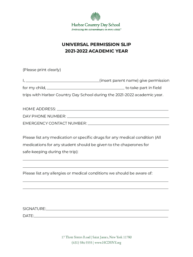 UNIVERSAL PERMISSION SLIP 20212022 ACADEMIC YEAR(Please print clearly) I, ___(insert parent name) give permission for my child, ___ to take part in field trips with Harbor Country Day School during