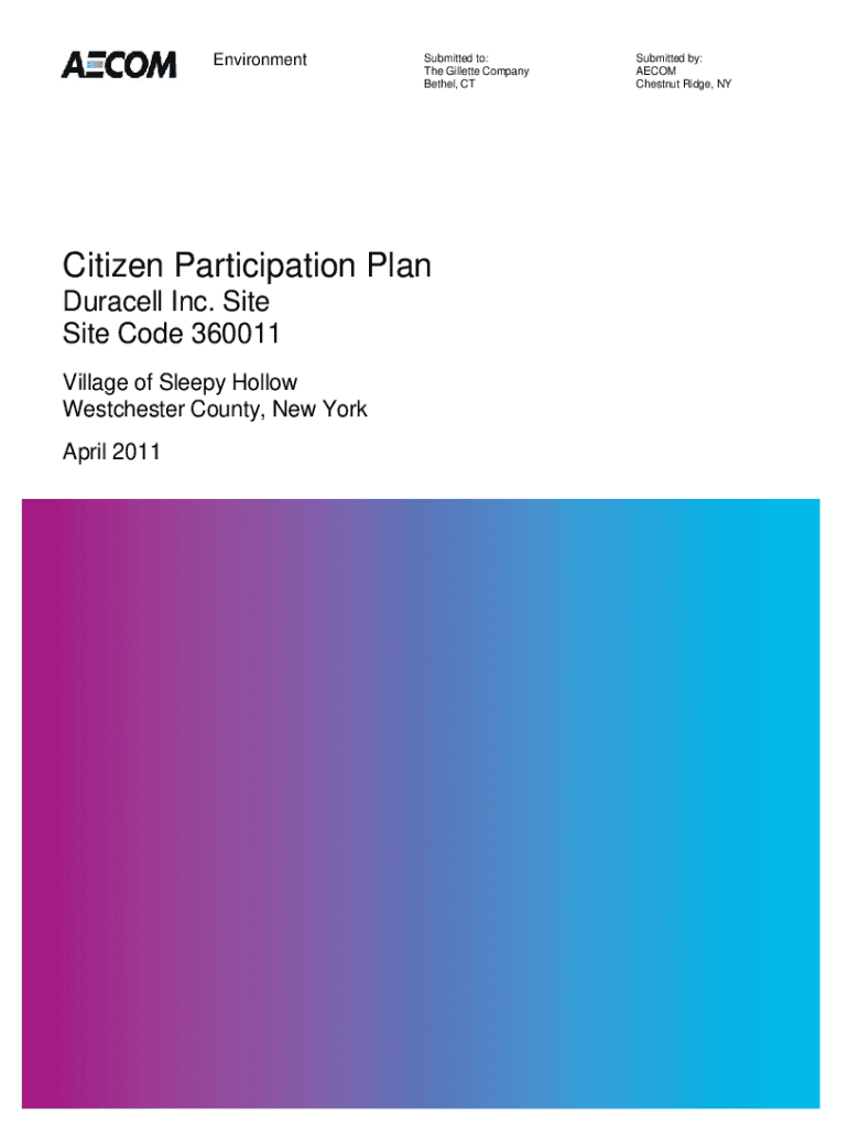 EnvironmentSubmitted to: The Gillette Company Ethel, Citizen Participation Plan Duracell Inc. Site Code 360011 Village of Sleepy Hollow Westchester County, New York April 2011Submitted by: AE COM