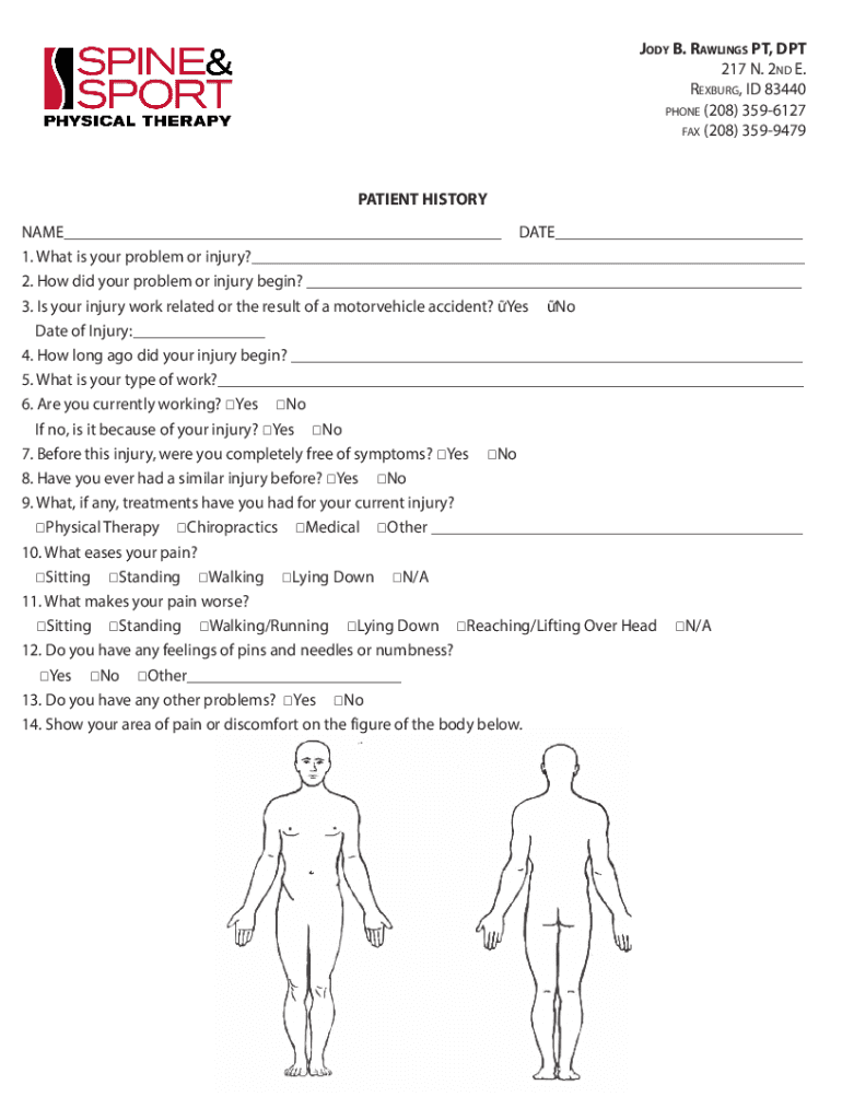 Jody B. Railings PT, DPT 217 N. 2nd E. Rexburg, ID 83440 phone (208) 3596127 fax (208) 3599479PATIENT HISTORY NAME___ DATE___ 1. What is your problem or injury?___ 2. How did your problem or injury