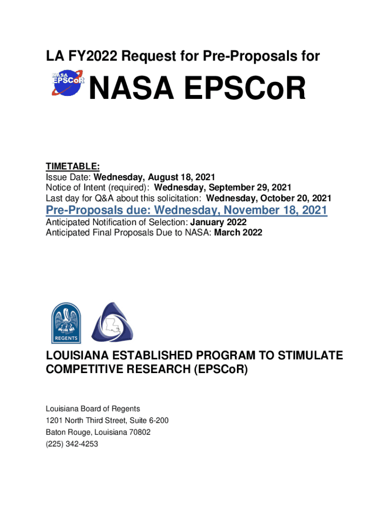 LA FY2022 Request for Proposals for NASA Escort TIMETABLE: Issue Date: Wednesday, August 18, 2021, Notice of Intent (required): Wednesday, September 29, 2021, Last day for Q&A about this solicitation: