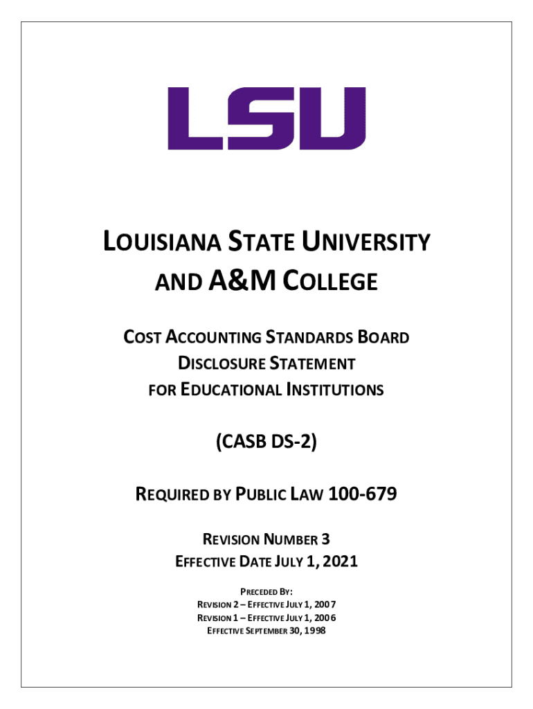 LOUISIANA STATE UNIVERSITY AND A&M COLLEGE COST ACCOUNTING STANDARDS BOARD DISCLOSURE STATEMENT FOR EDUCATIONAL INSTITUTIONS (CASE DS2) REQUIRED BY PUBLIC LAW 100679 REVISION NUMBER 3 EFFECTIVE DATE