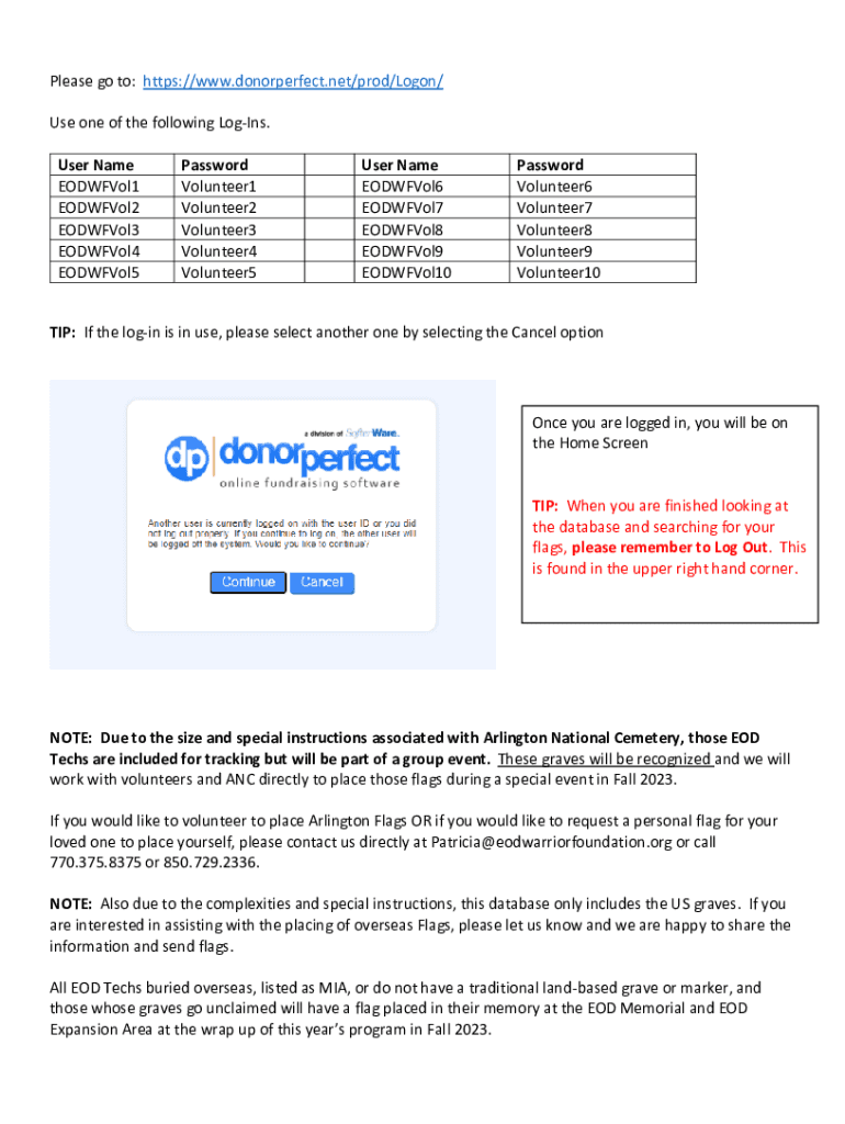 Please go to: https://www.donorperfect.net/prod/Logon/ Use one of the following Logins. Username EODWFVol1 EODWFVol2 EODWFVol3 EODWFVol4 EODWFVol5Password Volunteer1 Volunteer2 Volunteer3 Volunteer4