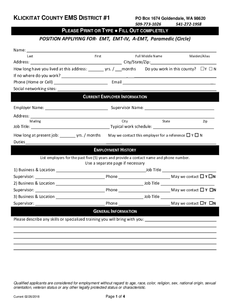 The KICKIEST COUNTY EMS DISTRICT #1PO BOX 1674 Golden dale, WA 9862050977310265412721958PLEASE PRINT OR TYPE FILL OUT COMPLETELY POSITION APPLYING FOR EMT, EM TIV, EMT, Paramedic (Circle) Name: LastFirstFull