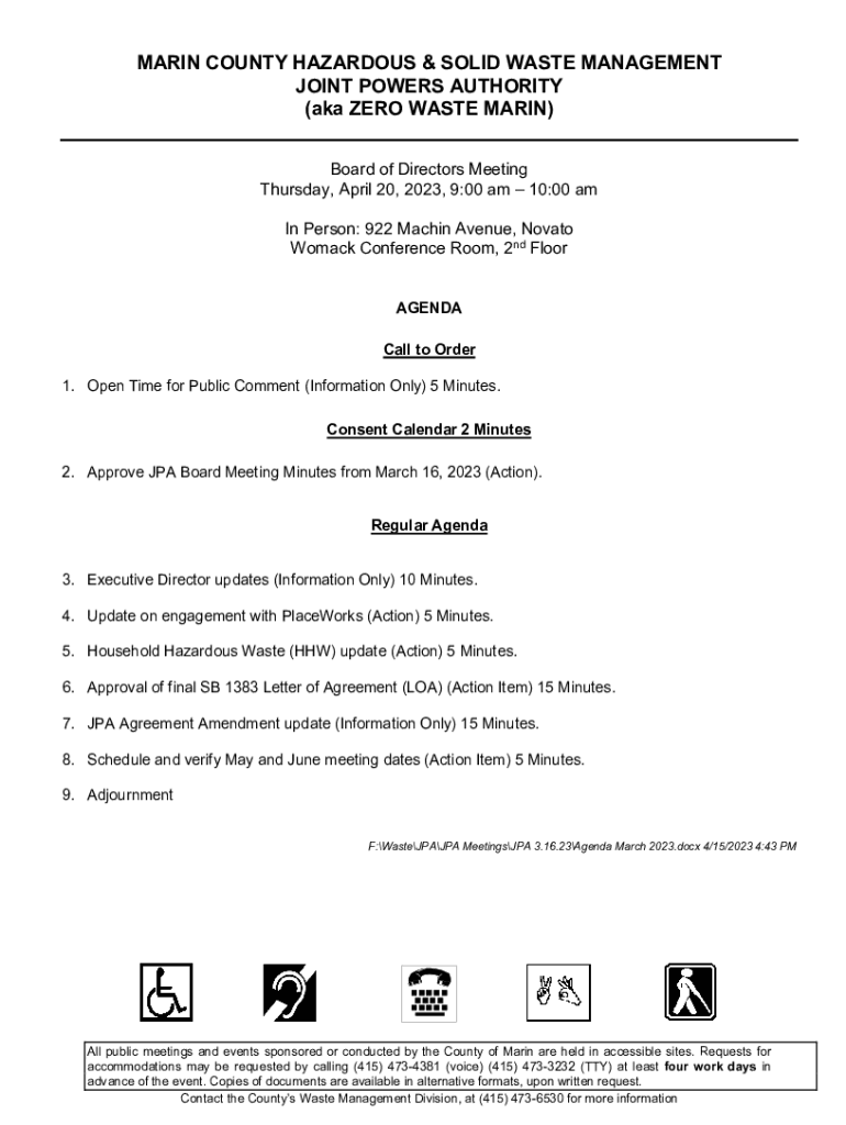 MARIN COUNTY HAZARDOUS & SOLID WASTE MANAGEMENT JOINT POWERS AUTHORITY (aka ZERO WASTE MARIN) Board of Directors Meeting Thursday, April 20, 2023, 9:00 am 10:00 am In Person: 922 Machine Avenue, Novato
