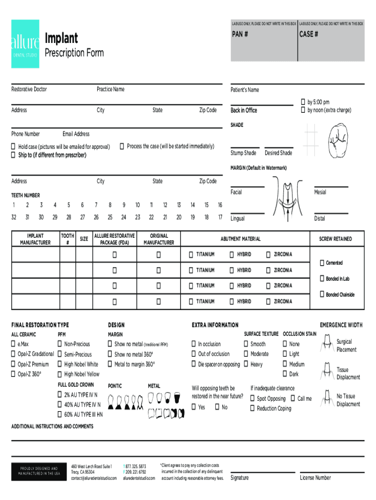 Implant USE ONLY, PLEASE DO NOT WRITE IN THIS BOXCAR USE ONLY, PLEASE DO NOT WRITE IN THIS BOX PAN #CASE #Prescription Form