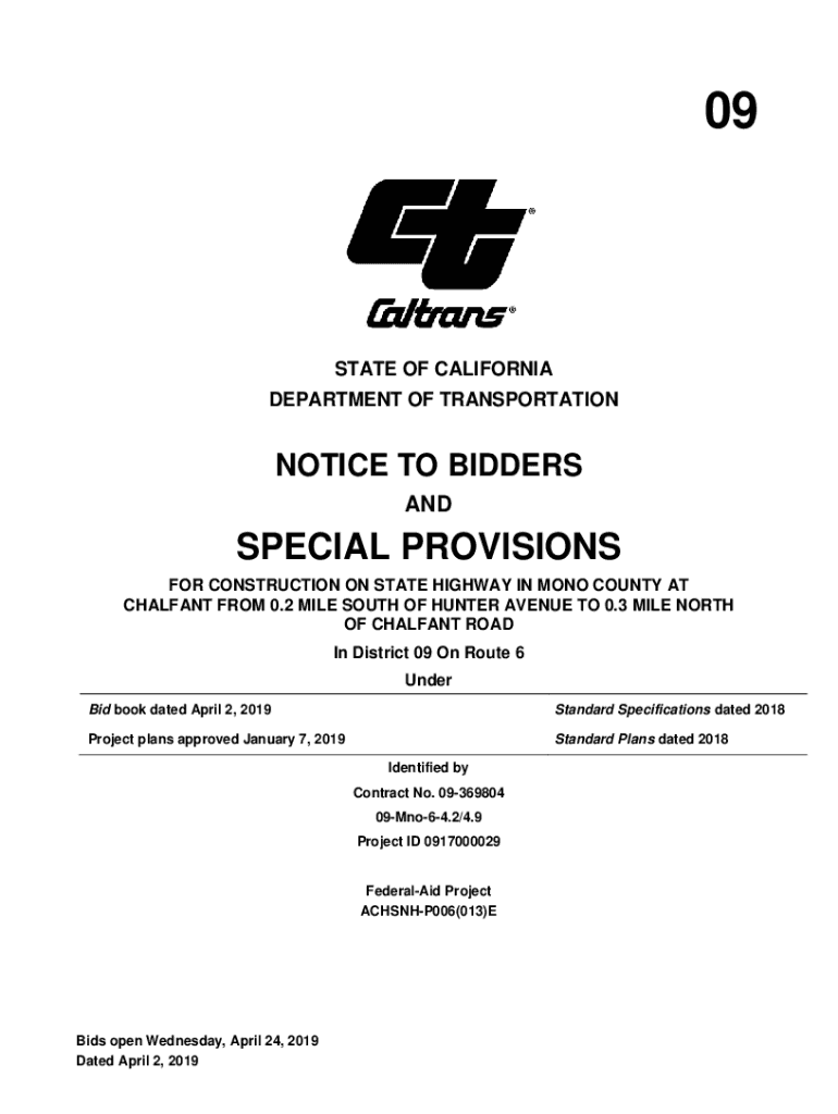 09STATE OF CALIFORNIA DEPARTMENT OF TRANSPORTATIONNOTICE TO BIDDERS SPECIAL PROVISIONS FOR CONSTRUCTION ON STATE HIGHWAY IN MONO COUNTY AT CHAPMAN FROM 0.2 MILE SOUTH OF HUNTER AVENUE TO 0.3 MILE