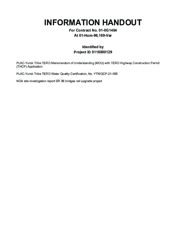 INFORMATION HANDOUT For Contract No. 010G1404 At 01Hum96,169Var Identified by Project ID 0116000129 Playbook Tribe TERM Memorandum of Understanding (YOU) with TERM Highway Construction Permit (THC)