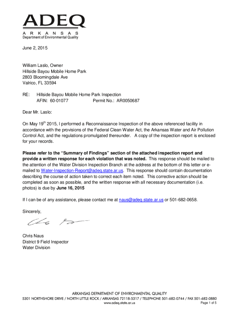 June 2, 2015William Lasso, Owner Hillside Bayou Mobile Home Park 2803 Bloomingdale Ave Valrico, FL 33594 RE:Hillside Bayou Mobile Home Park Inspection AKIN: 6001077 Permit No.: AR0050687Dear Mr. Lasso: