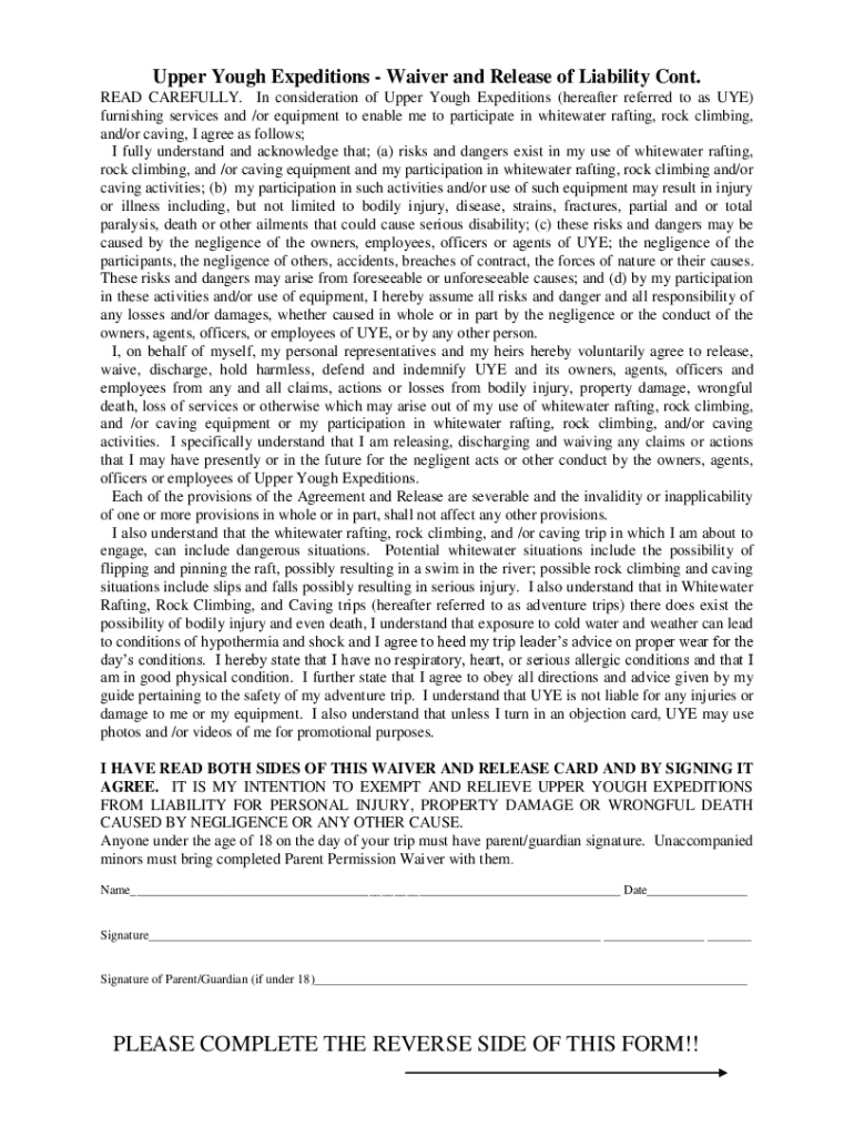 Upper Youth Expeditions Waiver and Release of Liability Cont. READ CAREFULLY. In consideration of Upper Youth Expeditions (hereafter referred to as USE) furnishing services and /or equipment to enable